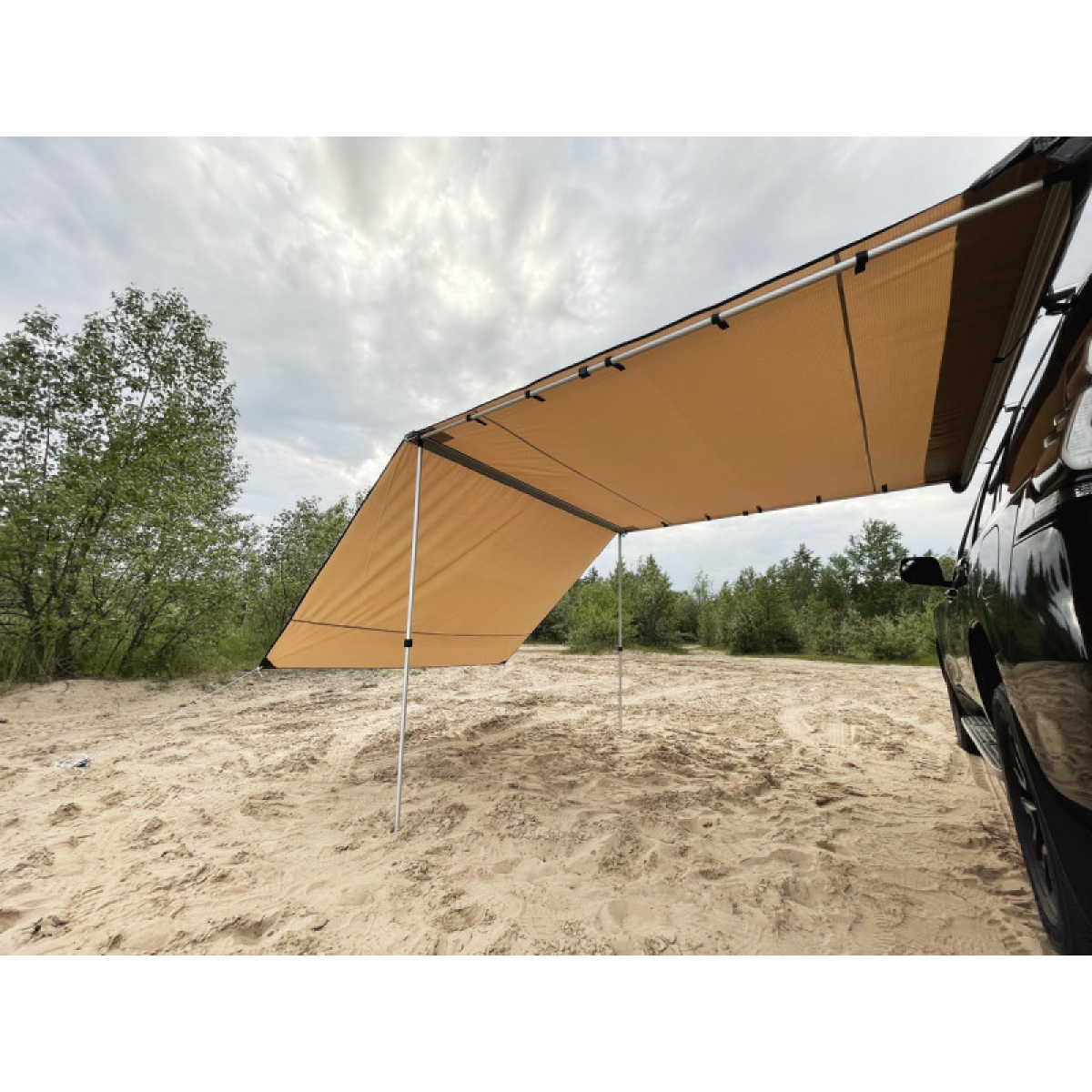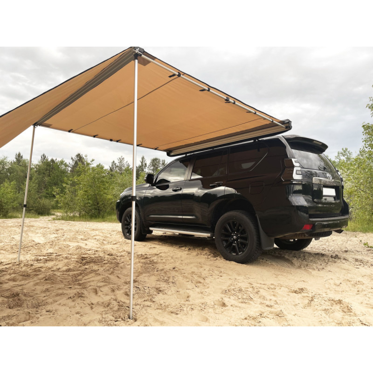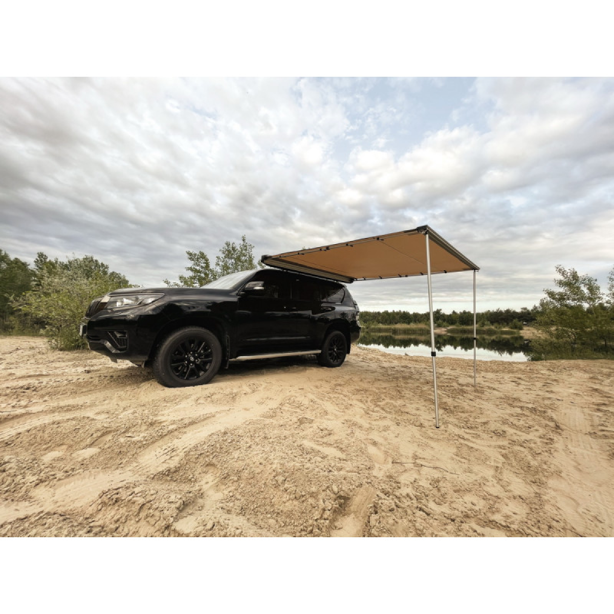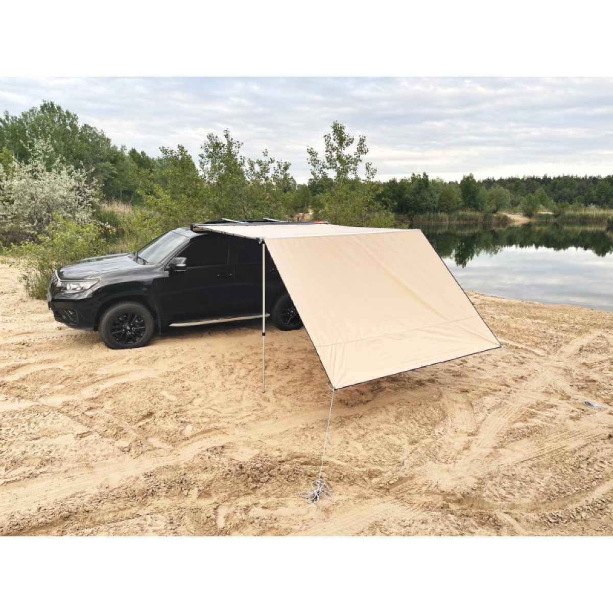 Маркіза поставляється в міцному чохлі з ПВХ, стійкого до будь-яких погодних аномалій, ультрафіолету і механічних пошкоджень, при їзді по бездоріжжю. Подвійна блискавка легко закривається і має можливість додатково надягати замок. Основа маркізи - алюмінієвий профіль на якому закріплені всі елементи (телескопічні стійки, розпірні стійки і т.д.). При установці маркізи тканина не виконує роль несучого елемента, а лише лягає на алюмінієву конструкцію. Сама маркіза виконана з високоміцної тканини Oxford 420D Ripstop з водовідштовхувальним просоченням і шаром поліуретанового напилення. Автомобільний бічний тент має розмір 2.5 х2.5 метра.