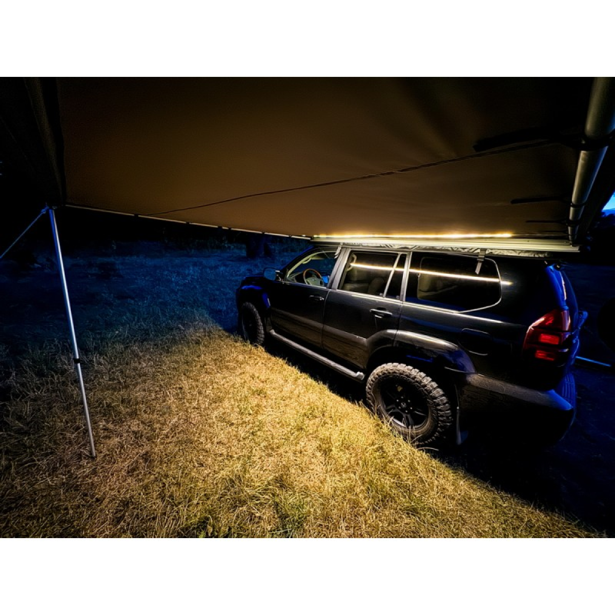 Посередині маркізи, з внутрішньої сторони, інтегровано лед-підсвітку. Вона працює від USB роз“єму в авто, або ж від павербанку. За допомогою контролера можна регулювати рівень яскравості світла.