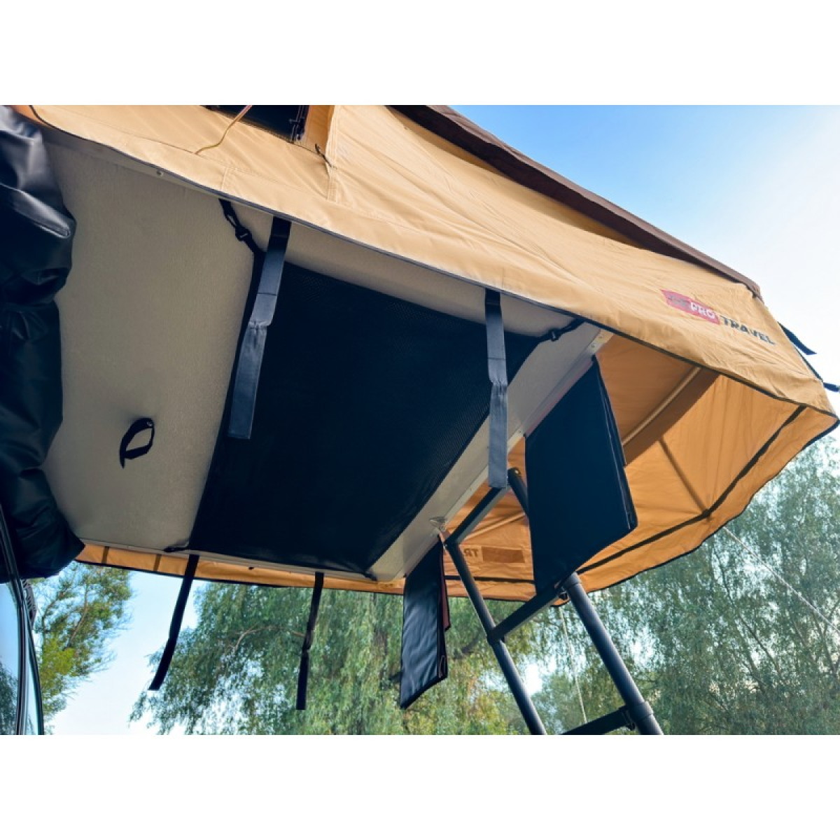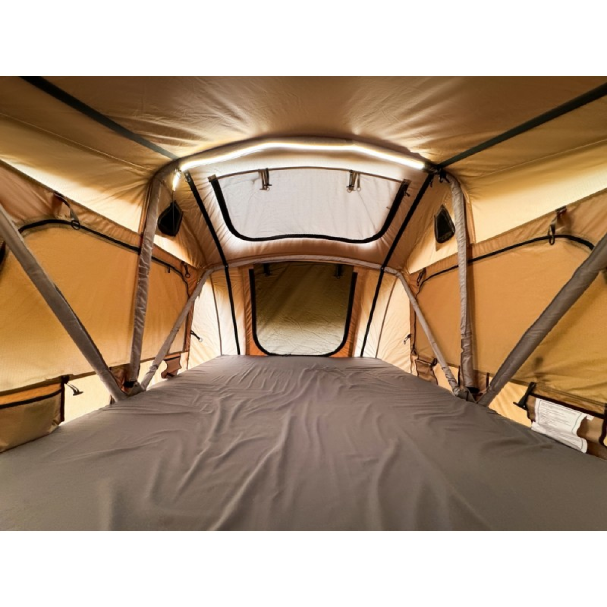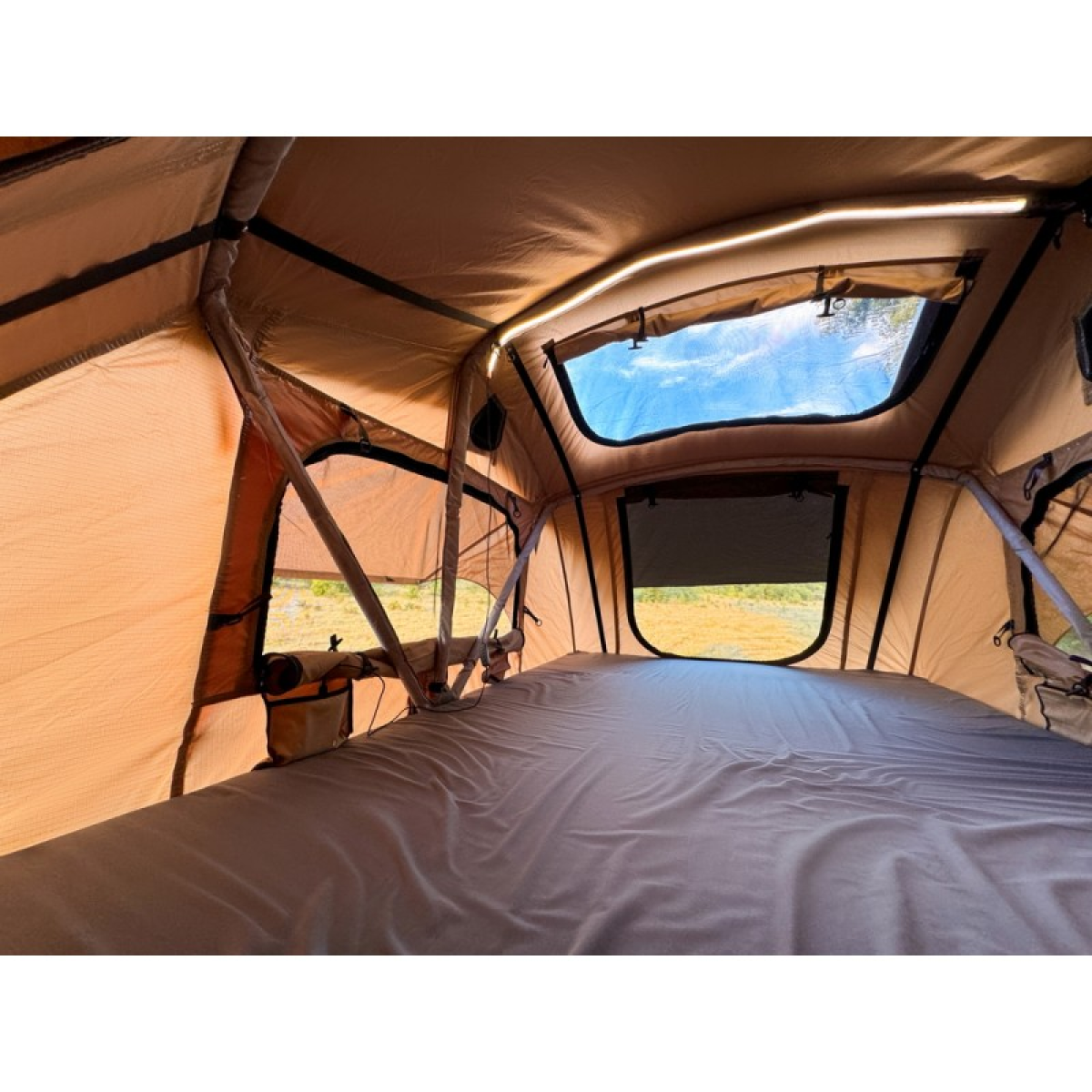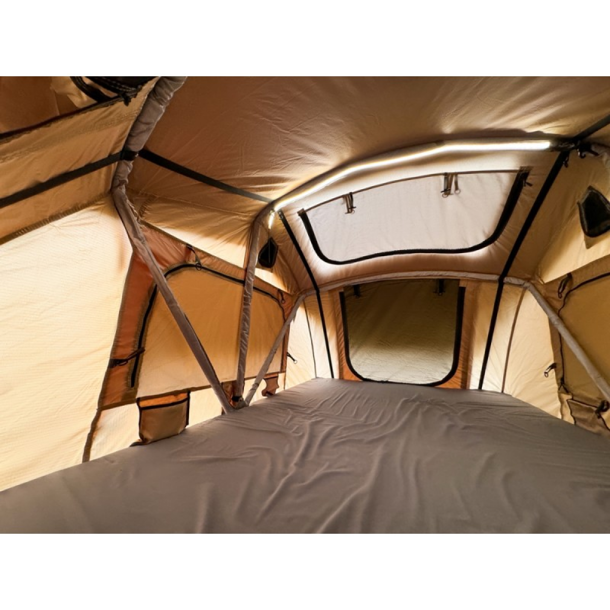 Найбагатша комплектація серед аналогів: дрібнокомірчасті москітні сітки на кожному вікні, панорамне стельове вікно, LED підсвічування всередині та м“який матрац з антиконденсаційним матом. Наявність кишень для ключів, телефонів та іншої дрібниці. Козирки над кожним вікном захищають від вітру та дощу. Розмір спального місця величезний – 240х140 см. Розміститься вся родина.