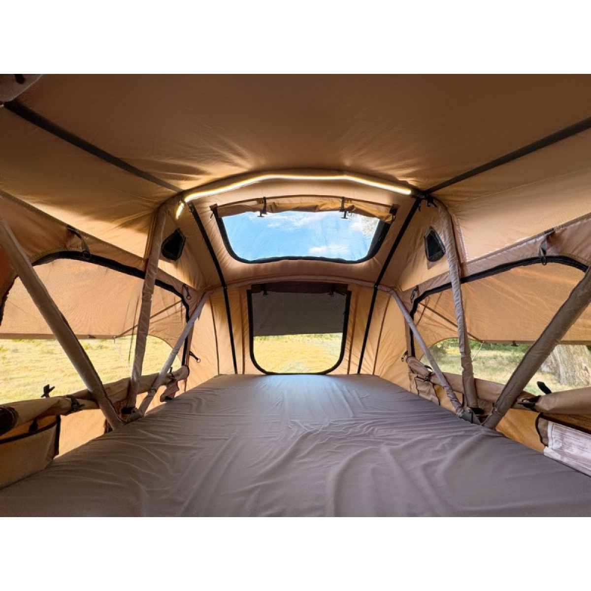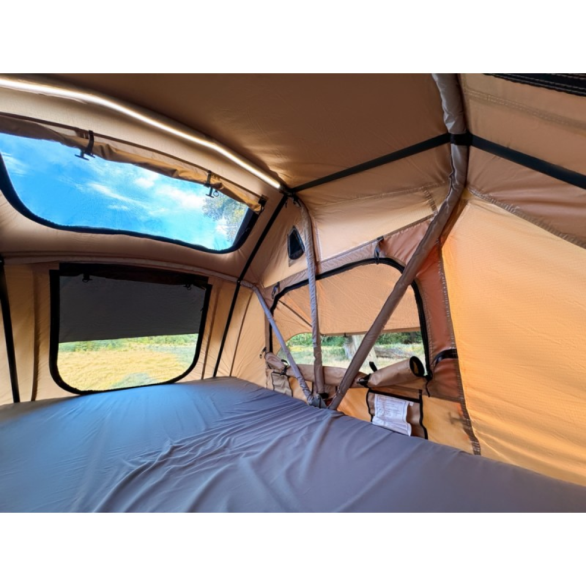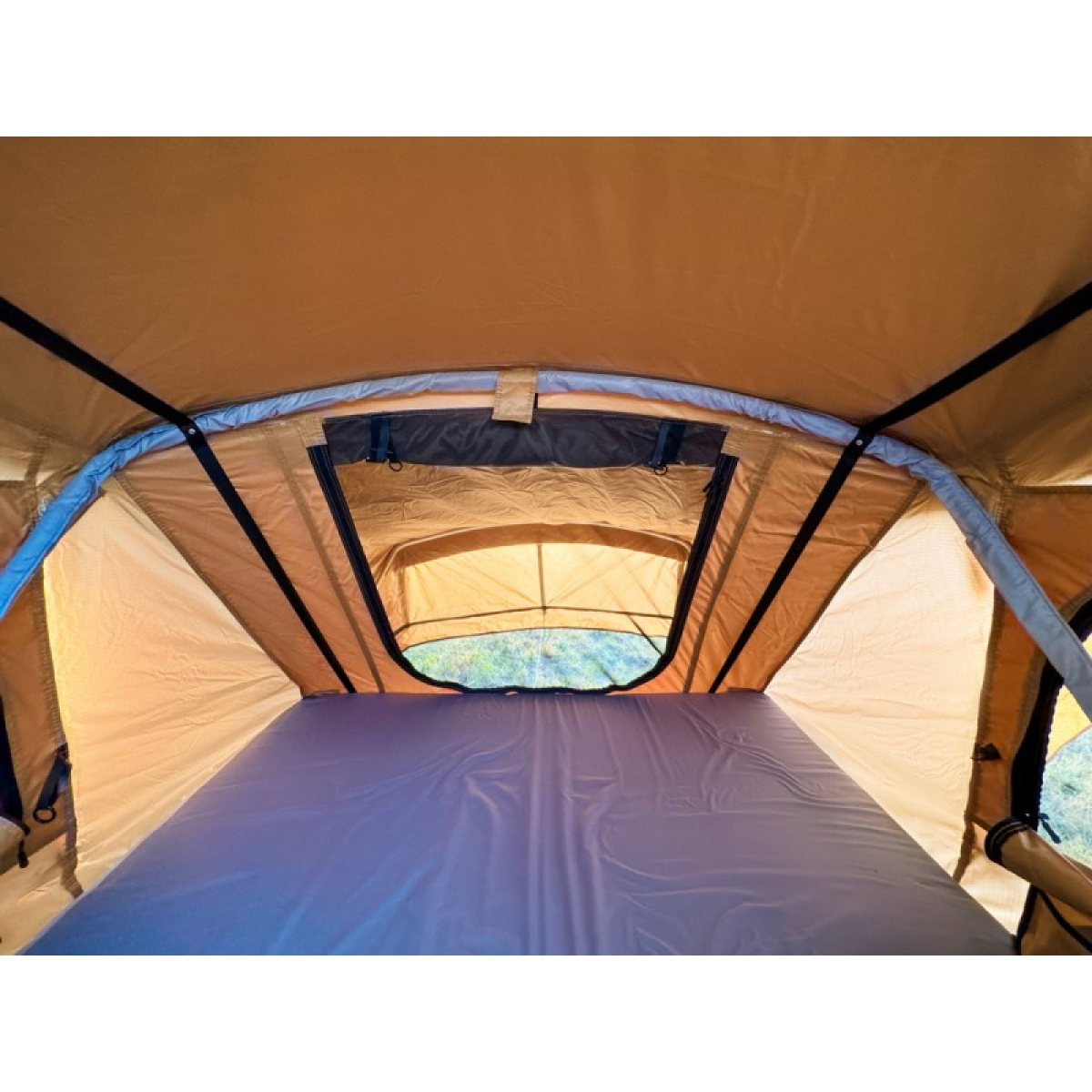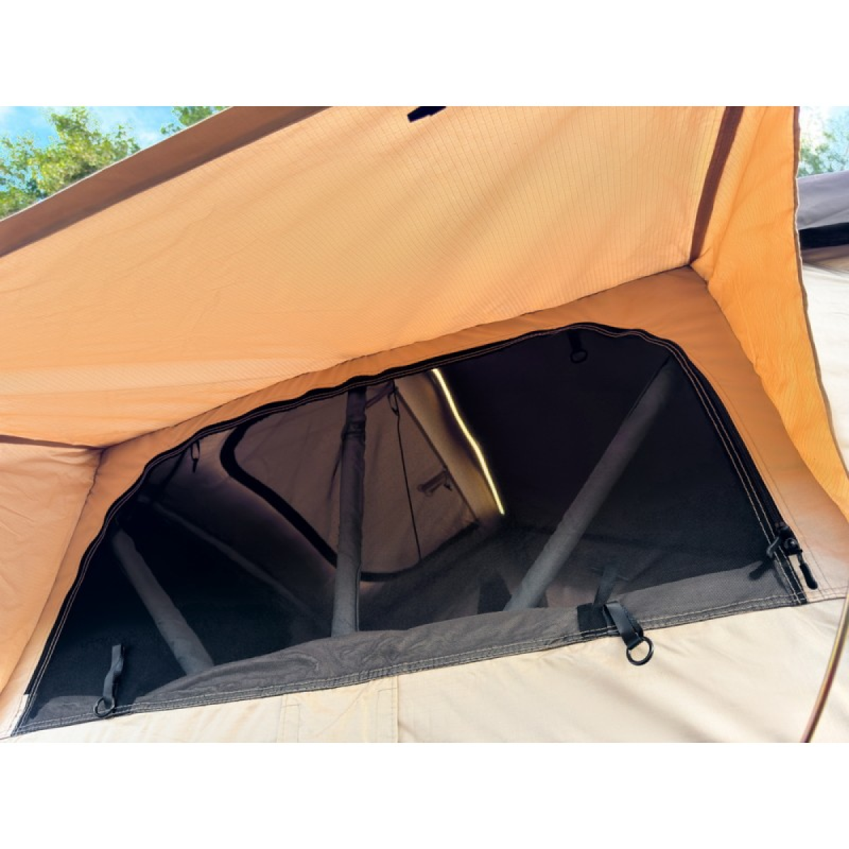 Найбагатша комплектація серед аналогів: дрібнокомірчасті москітні сітки на кожному вікні, панорамне стельове вікно, LED підсвічування всередині та м“який матрац з антиконденсаційним матом. Наявність кишень для ключів, телефонів та іншої дрібниці. Козирки над кожним вікном захищають від вітру та дощу. Розмір спального місця величезний – 240х140 см. Розміститься вся родина.