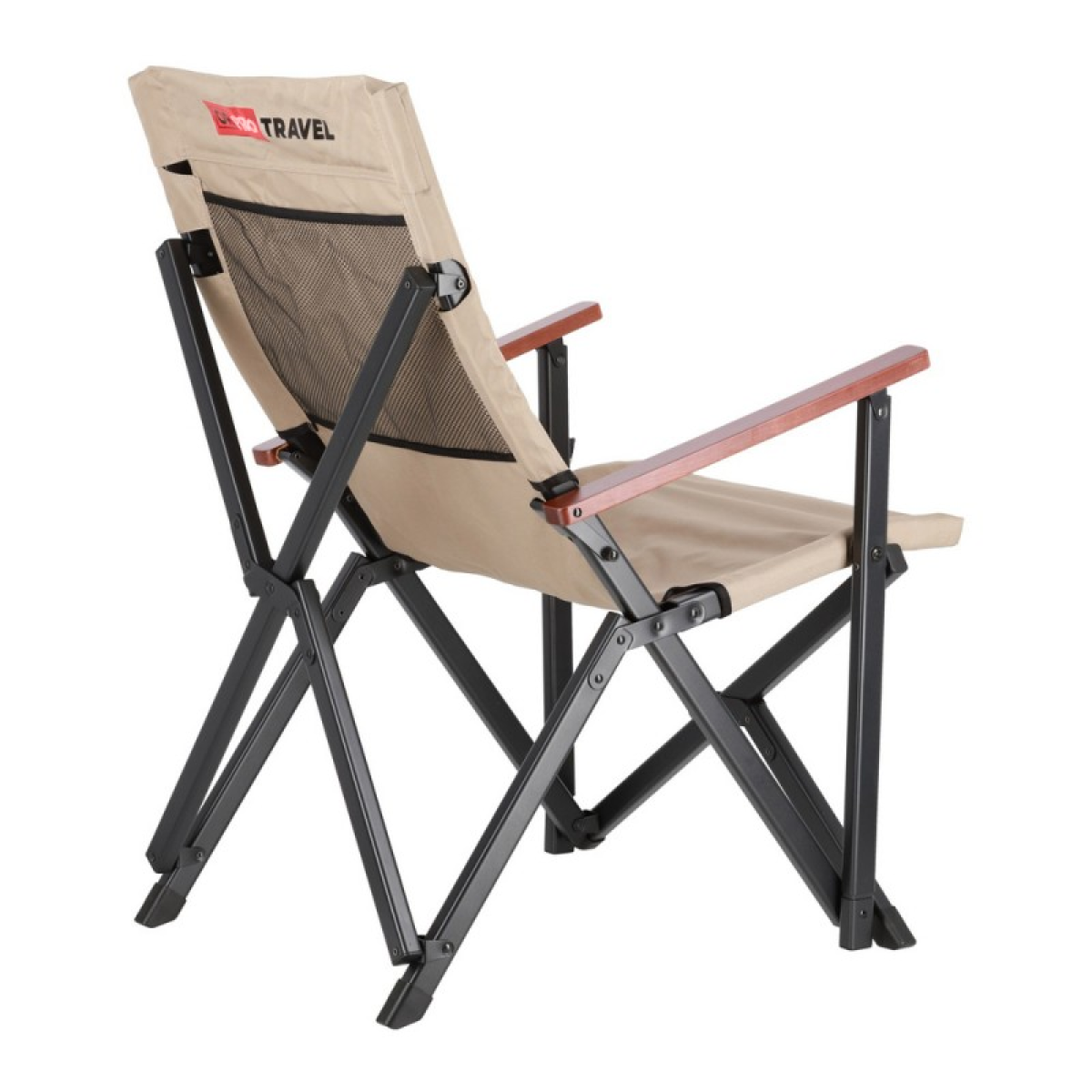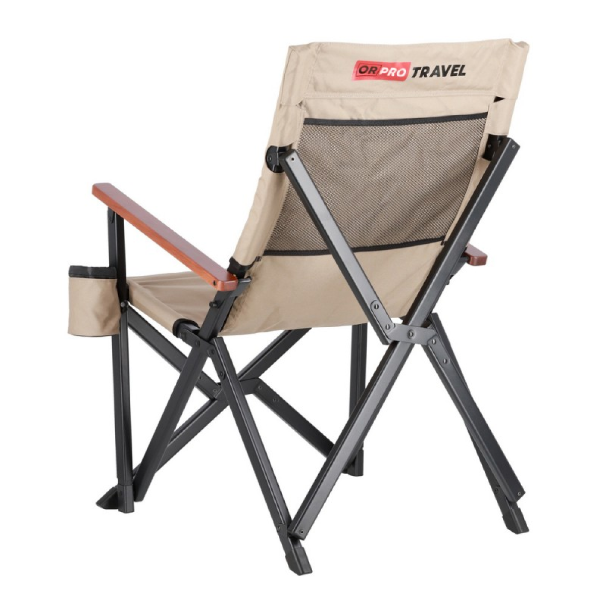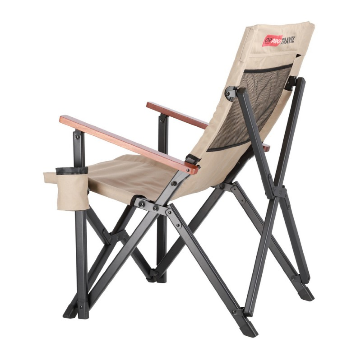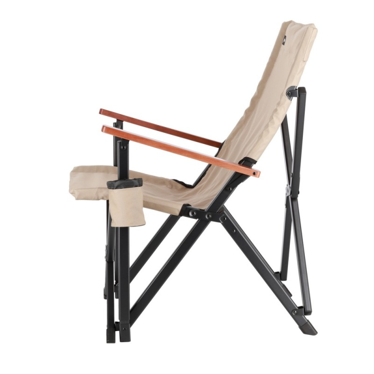 Підлокітники з натурального дерева – горіха не тільки естетичні, але й створюють додатковий комфорт, особливо для тривалого відпочинку. З лівого боку знаходиться підсклянник, що ідеально підходить для зберігання напоїв, телефону або іншої дрібниці. Ззаду, на спинці крісла, пришитий сітчасту кишеню (для чохла чи речей).