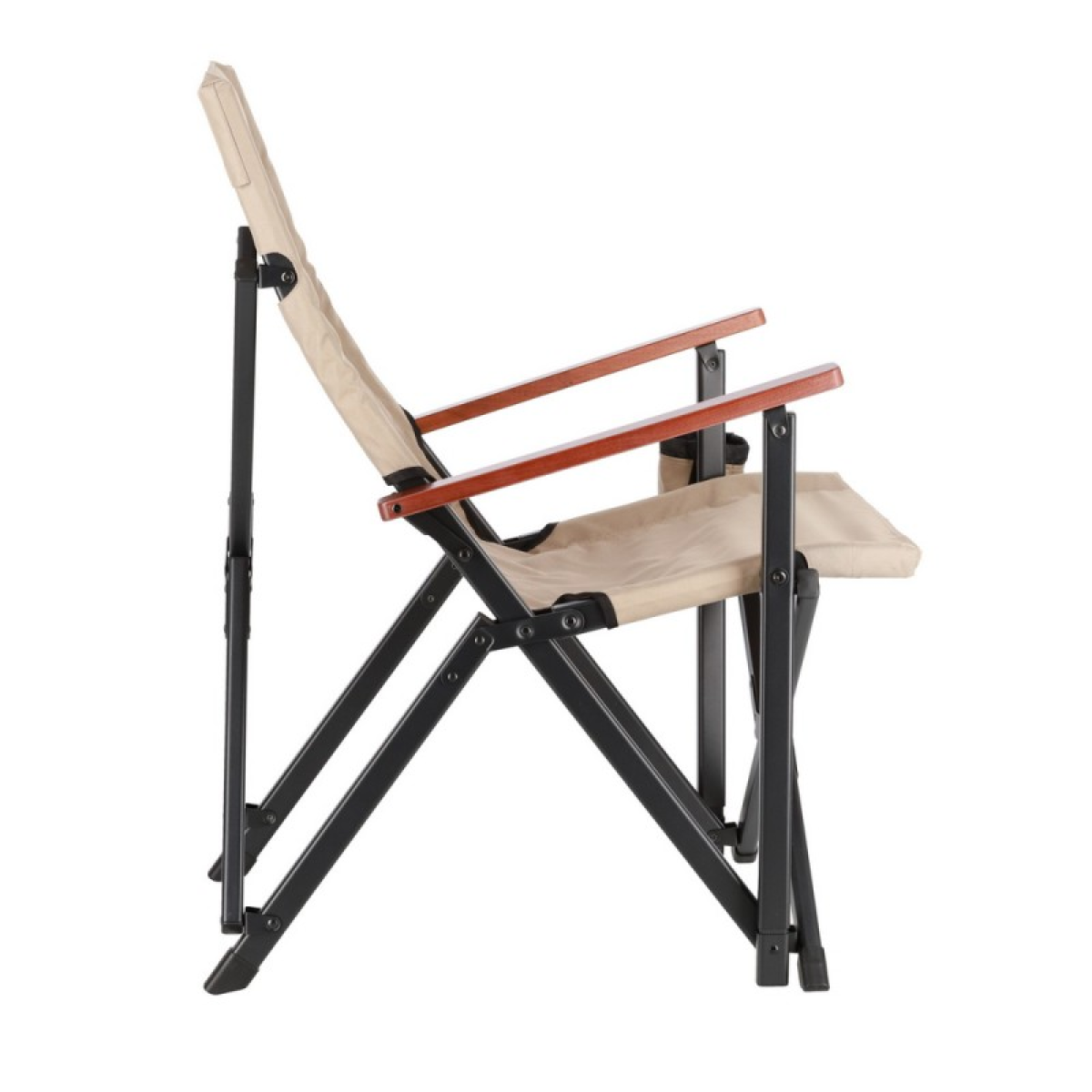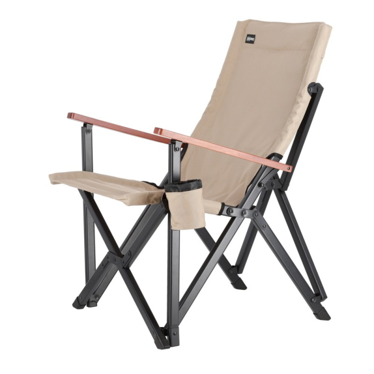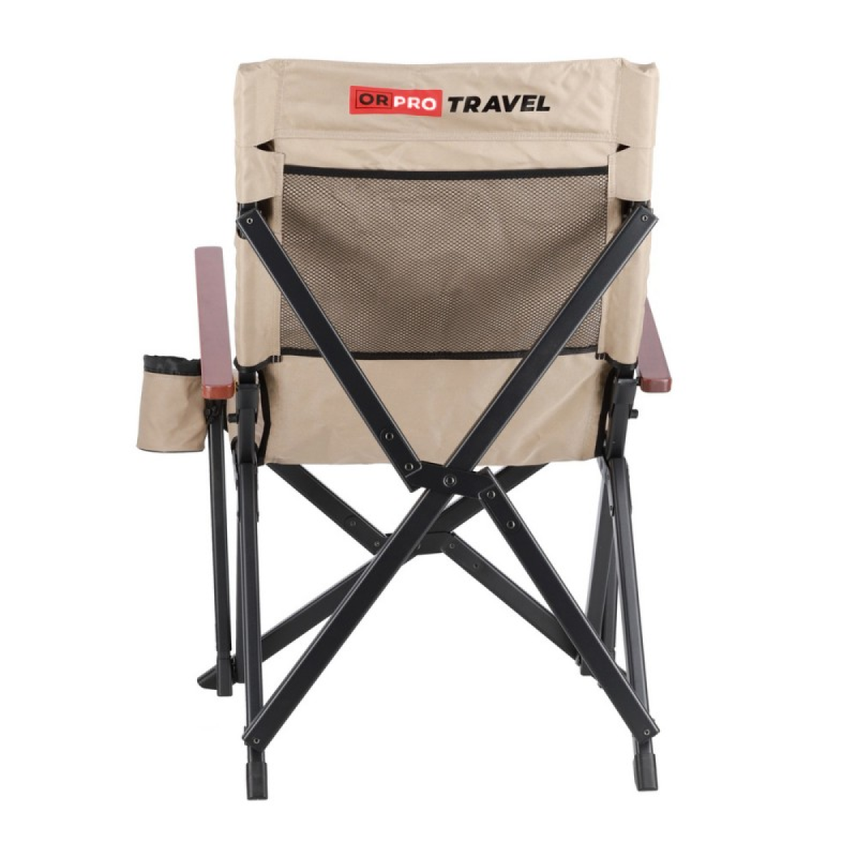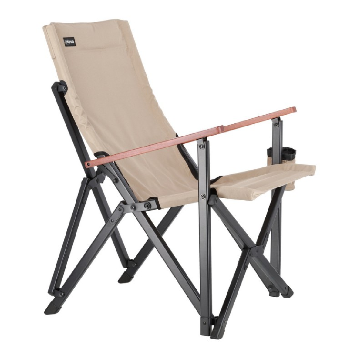 Підлокітники з натурального дерева – горіха не тільки естетичні, але й створюють додатковий комфорт, особливо для тривалого відпочинку. З лівого боку знаходиться підсклянник, що ідеально підходить для зберігання напоїв, телефону або іншої дрібниці. Ззаду, на спинці крісла, пришитий сітчасту кишеню (для чохла чи речей).